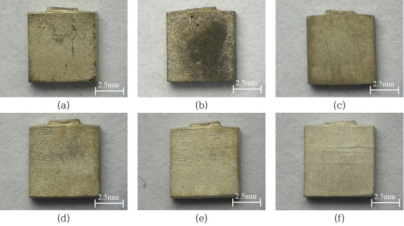 그림 1은 스트리핑 전과 스트리핑 후 SDS 함량에 따른 시편의 육안 분석 이미지이다. 그림 1 (a)는 주조 직후 시편의 이미지로, 광택이 없는 어두운 회색 표면을 확인하였다. 그림 1 (b)는 SDS가 첨가되지 않은 스트리핑 용액으로 처리한 시편 이미지이며, 표면에 검은색 막이 형성되었다. 이러한 현상은 Mohanty 등[13]이 보고한 티오우레아와 Ni이 반응하여 치밀한 검은 피막을 형성한다는 결과와 일치하였다.