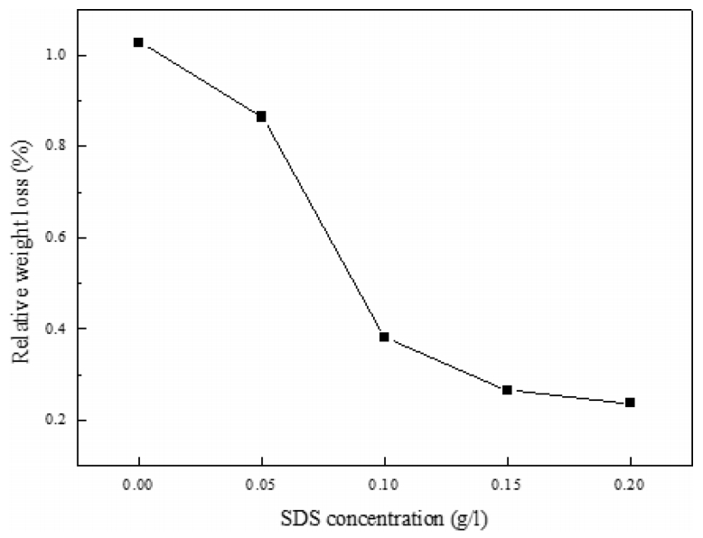 함량이 증가함에 따라 무게감소율이 작아지다가 SDS 0.15 g/L 이후 약 0.2%로 수렴하였다. 이러한 결과는 음이온성 계면활성제인 SDS가 합금의