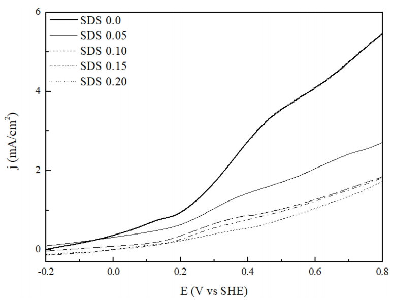 그림 5은 SDS 함량에 따른 LSV 분석 결과이다. 그래프에 표시한 바와 같이 SDS 첨가량이 증가함에 따라 산화전류밀도의 크기가 점차 감소하는 현상을