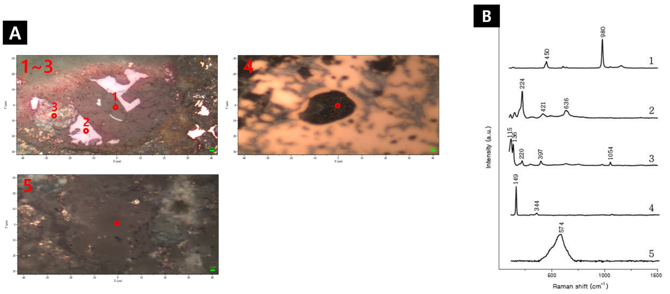 น์ ๋ถ์์์ฑ๋ฌผ๋ก 561 cm-1์ raman shift๊ฐ ๊ฒ์ถ๋์ด Cassiterite(SnO2)๋ก ํ์ธํ์๋ค. 3์ ํ์ ๋ถ์์์ฑ๋ฌผ๋ก 437, 974, 1054 cm-1์ raman shift๊ฐ ๊ฒ์ถ๋์ด Anglesite(PbSO4)๋ก ํ์ธํ์๋ค. 4๋ ํ์ ๋ถ์์์ฑ๋ฌผ๋ก 577 cm-1์ raman shift๊ฐ ๊ฒ์ถ๋์ด Cassiterite(SnO2)๋ก ํ์ธํ์๋ค. 5๋ ๋