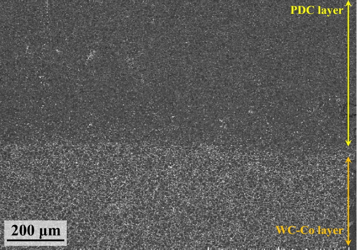 HTHP 소결 후 PDC 단면을 관찰하여 그림 2에 나타냈다. PDC 층을 살펴보면, 다이아몬드 이외의 상들(옅은 회색)이 분포하고 있었다. 상기 상들은 WC-Co 층에서 침출된 Co로 예상된다.
