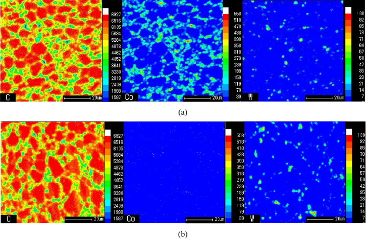 나타났다. 즉, EPMA 결과를 기반으로 그림 4b에 관찰된 흰색 상들은 WC임을 확인할 수 있었다. 또한 Co-leached PDC-B의 경우 SEM/EDS 결과(그림 4) 및 EPMA 결과(그림 5)를 기반으로 거의 대부분의 Co가 제거되었음을 확인할 수 있었다.