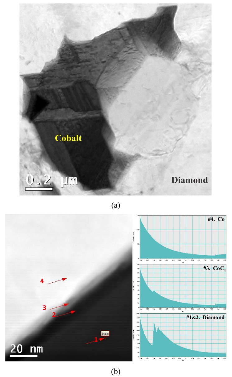 (a) Bright field TEM image of interface between diamond-Co, (b) corresponding selected