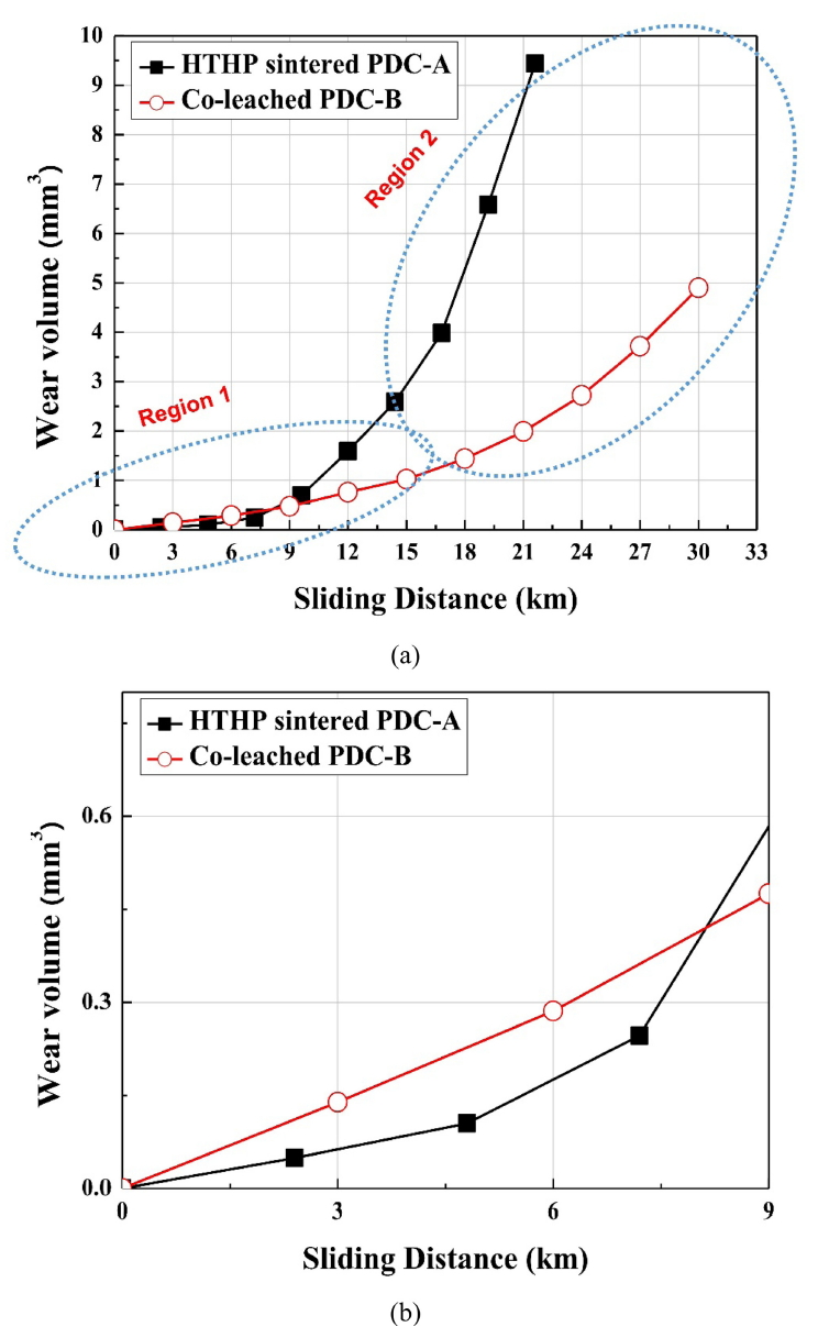 후로 9 km 이전 영역을 region 1, 이후 영역을 region 2로 구분하였다. Region 1을 확대하여 그림 7b에 제시하였다. 그 결과 HTHP sintered PDC-A가 Co-leached PDC-B에 비해 wear volume이 낮아 소폭 우수한 내마모
