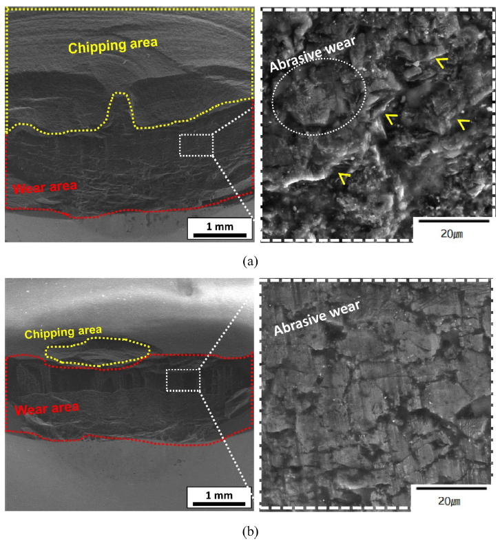 수 있다고 보고되었다 [6-10]. 본 연구에서 절삭 거리가 짧은 영역 (region 1; 그림 7)의 경우에만 마모 저항성에 미치는 Co 바인더의 긍정적 기여 효과가 유효함을 알 수 있었다. 그러나 이후 절삭 거리가 길어질 경우, 피삭재인 화강암과