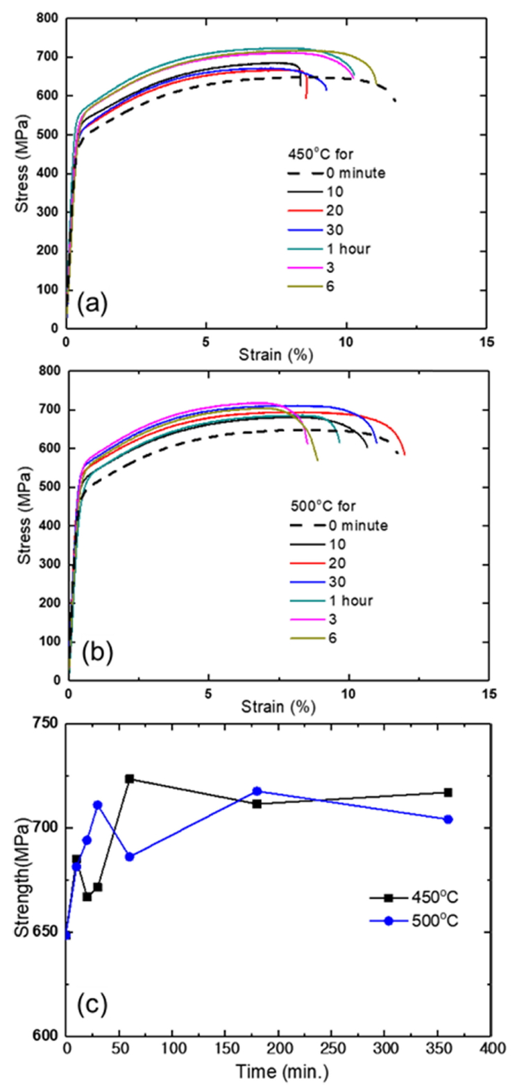 보였다 그런데, 500 °C에서 시효한 경우 급격한 경도 변화에서 보인 것과 달리, 인장강도의 큰 변화는 나타내지 않았다. 장시간 시효시 석출물 조대화가
