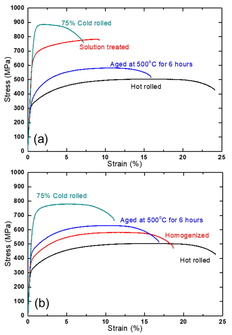 감소율로 냉간 압연하였다. 열간 압연, 용체화 및 균질화 처리, 시효 그리고 압연된 각각의 합금을 판상 시험편 (ASTM E8M)으로 가공한 후 상온에서