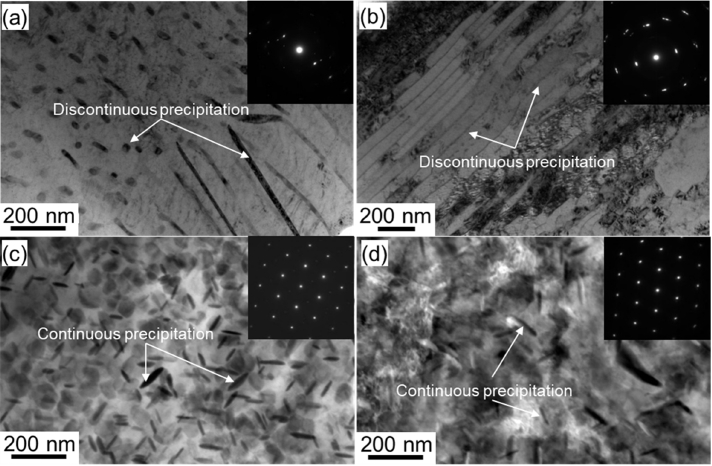 그림 7 (a)에 나타낸 바와 같이 시효 후 섬유형태의 Ni2Si 금속간 화합물이 불연속 석출로 생성되었고 이 것을 압연하였을 때, 그림 7 (b)와 같이 불연속 석출물 일부가 압연 중 배향되었음을 보였다. 반면, 균질화 처리된 합금을 시효했을 때, 그림 7 (c)에 나타낸 바와 같이 디스크 형태의 Ni2Si 금속간화합물이 석출되었음이 확인되었다. 그리고 이 것을 압연했을 경우는 석출물의 크기나 형상이 그림 7 (d)에 나타낸 것처럼 가공후 형태가 크기가 변화되지 않았음을 확인하였다. 이는 그림 5에 나타낸 바와 같이 용체화 또는 균질화 처리한 시편의 압연 후 강도 변화가 차이가 있음을 설명하는데 중요한 근거를 제공한다. 즉 균질화 처리한 시편의