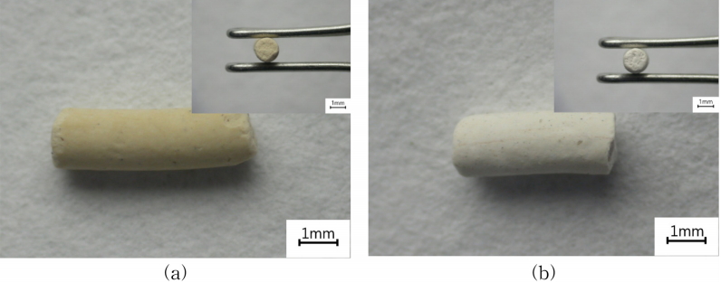 mm, 길이 6.88(±2) mm의 원기둥 형태를 가진 것을 확인하였다. 그림 1 (b)는 13X 제올라이트 시료의 광학현미경 이미지이며, 우 상단에 삽입한 이미지는 13X 제올라이트의 단면을 나타내었다. 13X 제올라이트는 지름 1.62(±0.2)