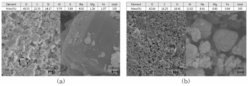 크기를 가진 괴상체로 구성되어 있는 것을 확인할 수 있었다. 괴상의 EDS 결과 Si, Al, Na이 주성분으로 확인되었고, 앞서 확인한 바와 같이