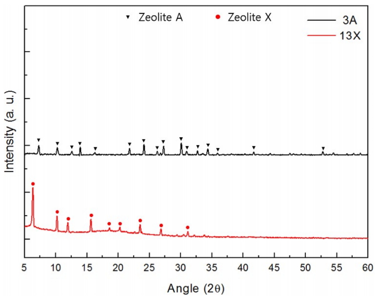 나타내었다. 3A 제올라이트는 K이 포함된 LTA-type(4-ring)으로 구성되어 있었으며, 13X 제올라이트는 Na이 포함된 FAU-type(6-ring)으로