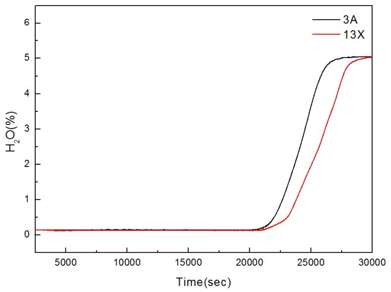 그림 6에는 3A 및 13X 제올라이트의 수분 흡착 정도를 확인할 수 있는 breakthrough curve를 나타내었다. 5% 수분에 대한 파과(breakthrough)되는
