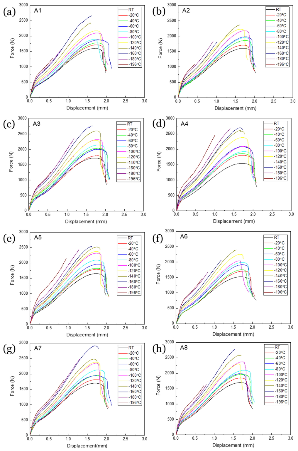 원자로 압력용기강들의 온도별 소형펀치 시험 후 하중-변위 곡선을 그림 2에 나타내었다. 시험 온도가 감소함에 따라 변형 시 걸리는 하중이 증가하고 변위가 감소하는 형태를 보였다. 시편 종류에 따라 차이가 있지만 -160