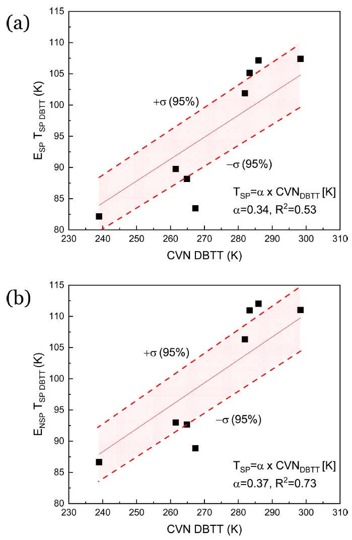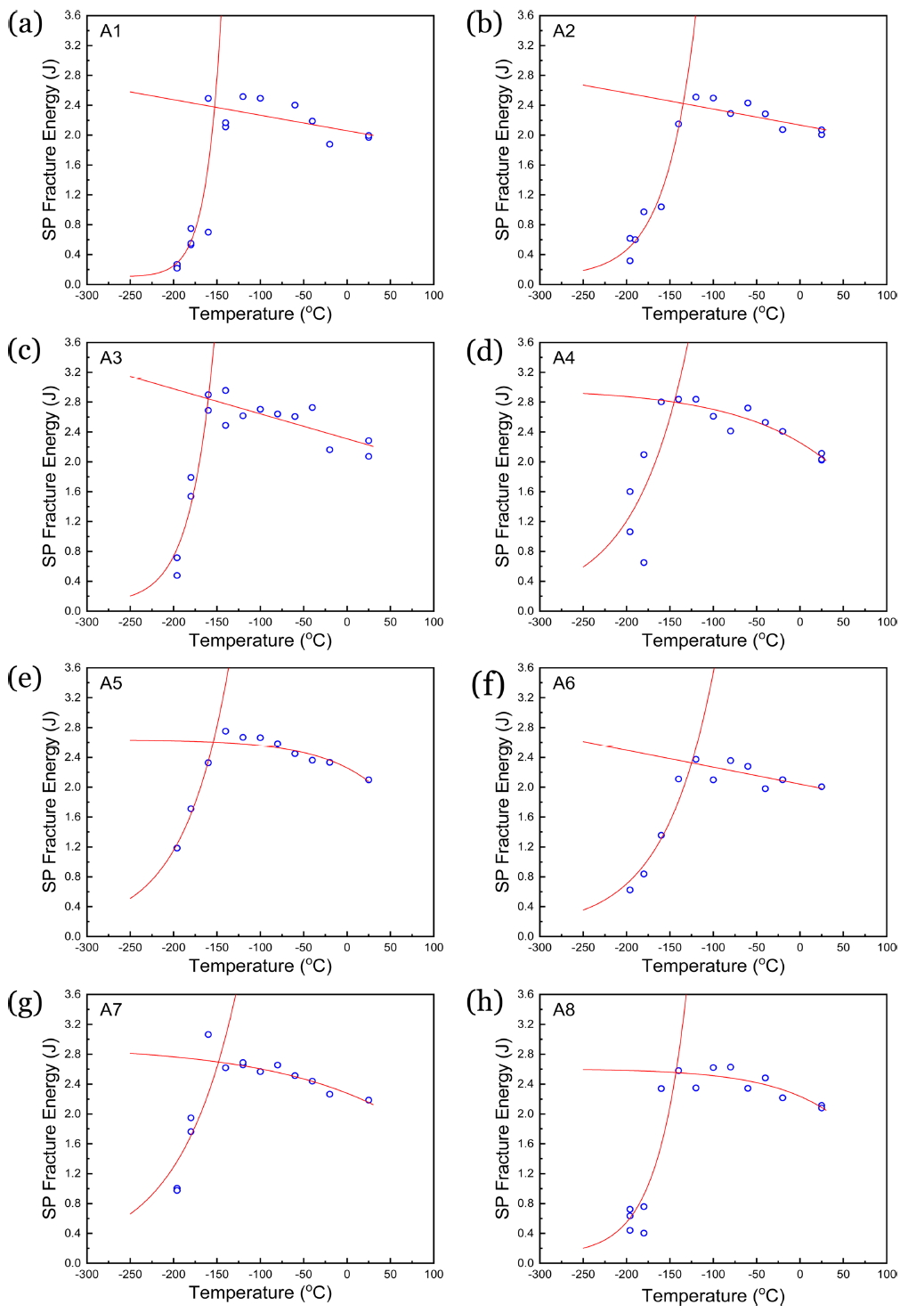이때 α값은 특정지점의 소형펀치 천이온도 와 충격시험 천이온도의 경험적 상관 계수를 의미한다. 기존 연구에서는 ESP 를 통해 CVNDBTT을 평가할 때 TSP 는 상부 ESP와 하부 ESP 의 중간지점(ESP_DBTT)을 잡아서 평가하는 경우가 많았다 [20,23,24]. 그 외로 충격 시험의 흡수에너지가 41J 일 때의 지시온도(T41J)와 같이 특정 에너지 지점의 천이온도와 SP 천이온도를 연관짓기 위하여 ESP 가 1.2J 혹은 1.0J 같이 특정 파단에너지일 때의 온도를 CVNDBTT, T41J과 비교하기도 하였다 [20,29,30].