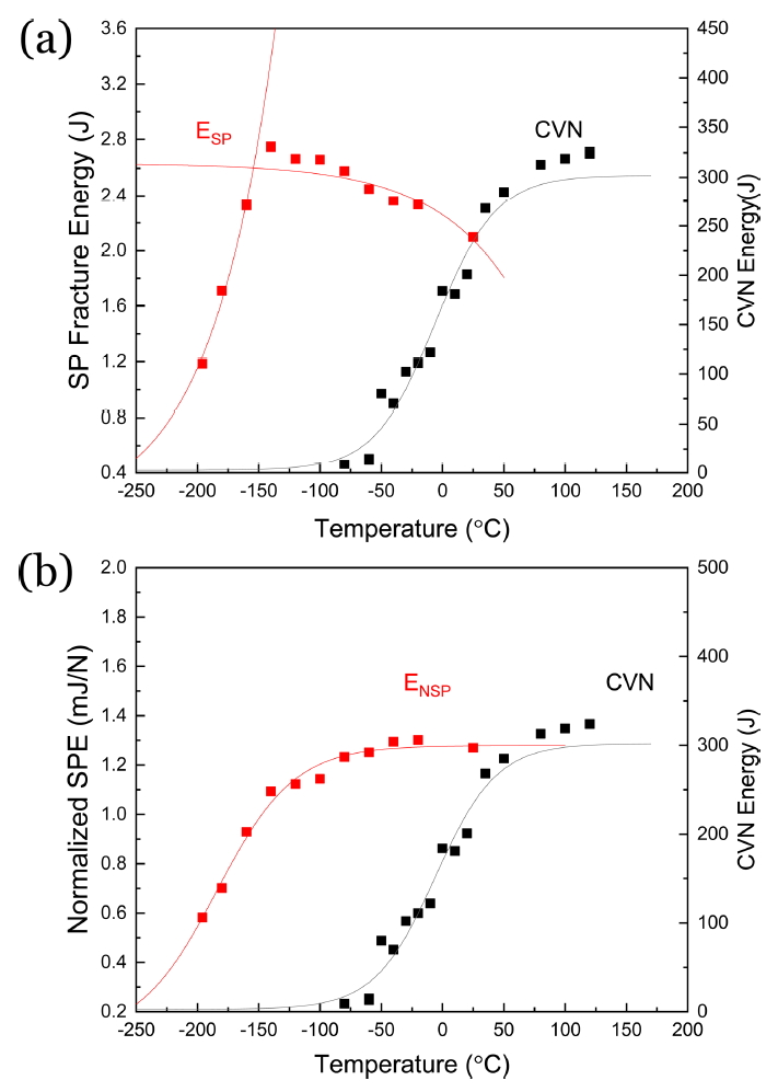 초기 표준화 문서인 ASTM WK47431에서는 기존에 많이 연구했던 소형펀치 파단에너지(ESP)를 통해 천이특성을 평가하는 방법을 기술하였다. [18-21]. 그러나 이후 변경된 ASTM WK61832에서는 ESP를 최대 하중(Fm)으로 나눠 얻어낸 정규화된 소형펀치 파단에너지(ENSP)를 사용해 천이특성을 평가하는 것으로 변경되었다. 두 방법 모두 소형펀치 시험으로 얻은 소형펀치 천이곡선과 충격 천이곡선의 상관관계를 경험적으로