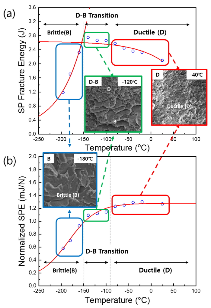 변형에 필요한 하중증가량이 변위 감소량보다 더 크기 때문이다 [21]. -160 °C이하의 온도에서는 최대 하중점에 도달하기 전에 파단이 발생하면서 ESP가 크게 감소하여 급격한 천이거동을 보여주었다. 이러한 ESP를 이용한 천이 곡선의 경우 천이구간을 정확하게 정의하기 어려우며 천이 곡선적합시 연성파괴 구간과 취성파괴 구간을 사용자가 직접 구분하여 곡선적합을