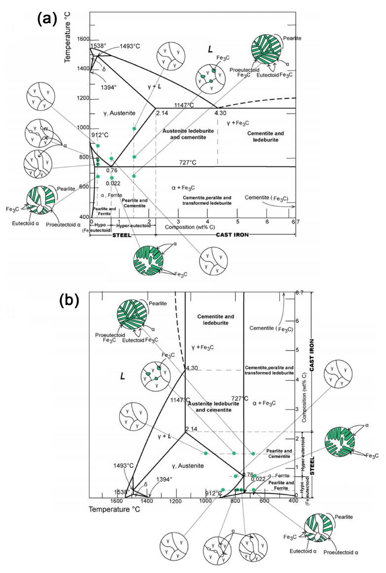 in morphologies and microstructures in the Fe–C phase diagram according to temperature