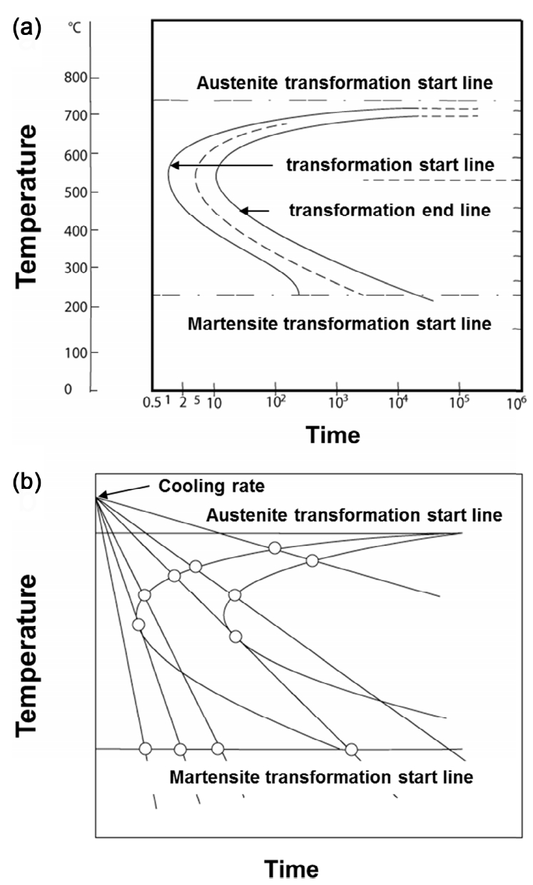 phases can be observed in a separate time-temperature-transformation (TTT) curve [19] (Fig 4a) or a continuous cooling transformation (CCT) curve [20] (Fig 4b).