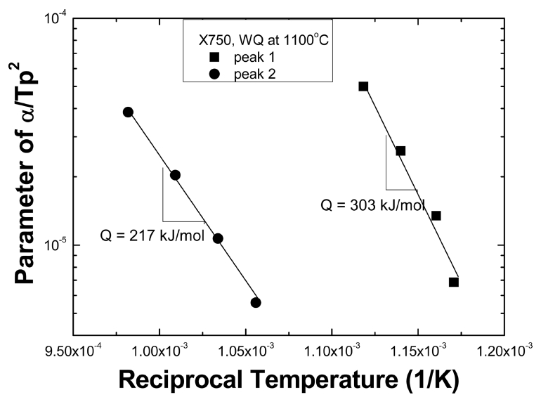 ๋ฐ 2์ ๋ํ Q๋ ๊ฐ๊ฐ 303 ๋ฐ 217 kJ/mol๋ก ๋ํ๋ฌ๋ค. ํ 2 ๋ฐ 3์ Kissinger ๋ฐฉ๋ฒ์ ์ด์ฉํ์ฌ WQ X-750 ์ฌ๋ฃ์ peak 1 ๋ฐ peak 2 ๋ฐ์ด ๋ฐ์์ ๋ํ Q๋ฅผ ๊ตฌํ ๊ณผ์ ์ ์์ธํ ๋ํ๋ธ ๊ฒ์ด๋ค.