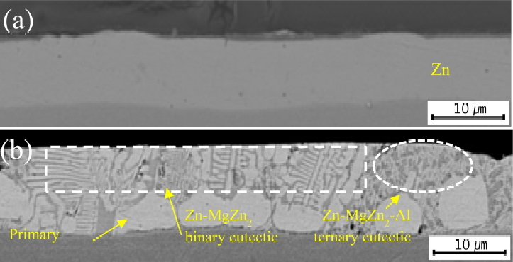 Cross sectional morphologies of (a) GI and (b) Zn-Al-Mg coated steel sheet