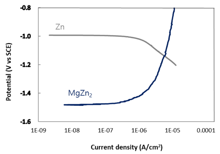 Potentiodynamic polarization curves of Zn and MgZn2 specimens in a 5% NaCl solution.