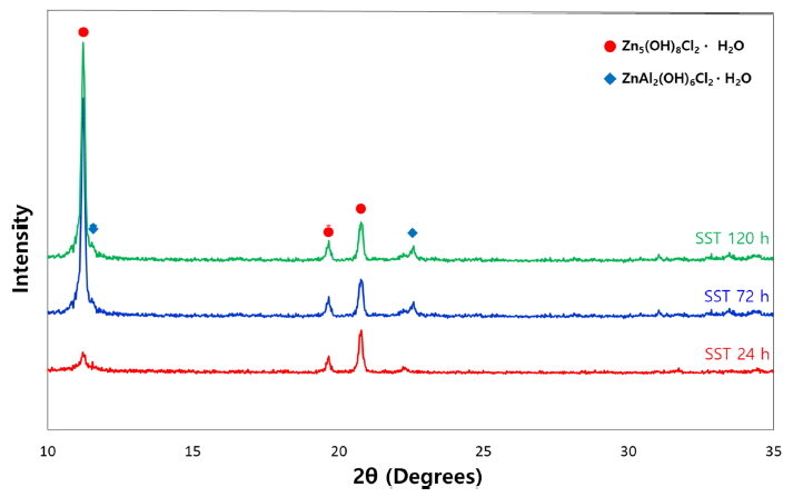 24시간 진행된 시편에서는 Zn5(OH)8Cl2· H2O이 단독 형성된 것으로 분석되나, 72시간 진행 이후부터는 simonkoleite (Zn5(OH)8Cl2·H2O)와 hydrotalcite (ZnAl2(OH)6Cl2·H2O)가 복합적으로 형성되어 존재하는 것으로 확인되었다. 물론, Al 함량 (> 5%)이 높은 3원계 합금도금강재의 경우 ZnAl2(OH)6Cl2·H2O의 형성이 보고된 바 있으나, Al 함량이 Mg 함량과 유사하게 낮은 성분계를 가지는 합금도금강재의 경우, 염수의 농도가 3.5% 이하의 조건에서