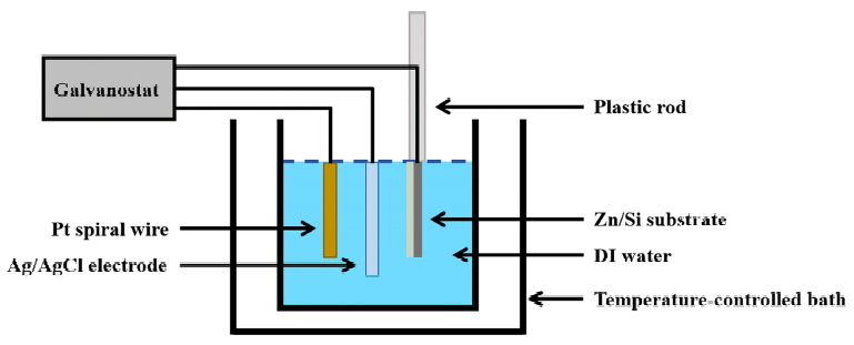 cathode, and reference electrode; the Zn films deposited on the Si substrates and
