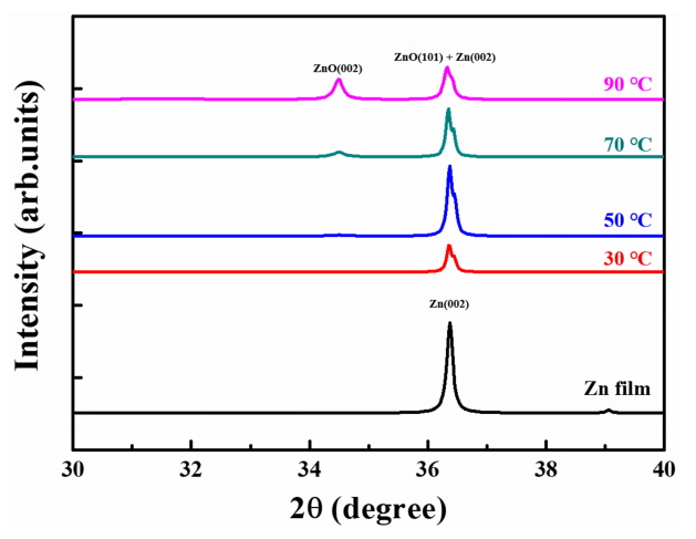 at 30, 50, 70, and 90 °C. The Zn film has a strong diffraction peak located at around