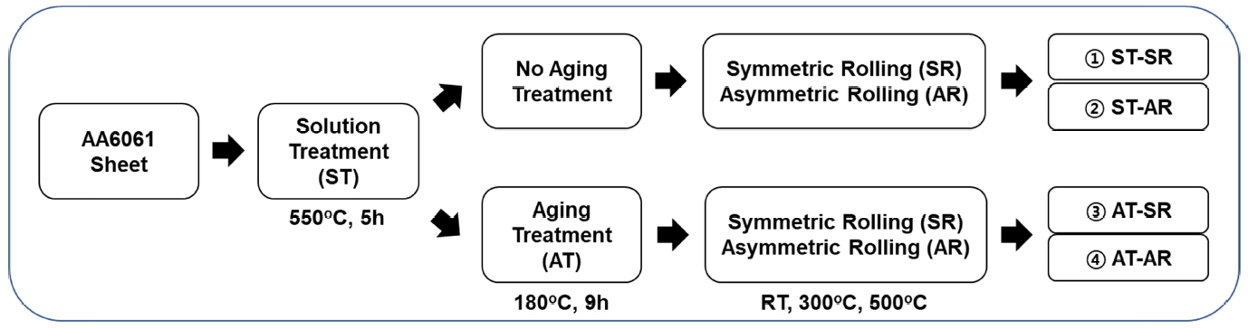 처리된 알루미늄합금 판재는 비대칭압연에 의해 전단변형이 가해졌으며 비교를 위해 대칭압연도 함께 진행되었다. 압연에 사용된 합금 판재의 크기는 100
