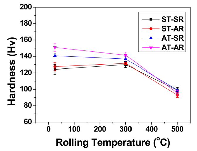 변화를 알아보기 위하여 압연온도는 상온, 300 °C, 500 °C로 변화되었으며, 각 열처리 및 압연조건에 따른 시편들의 명칭을 표 2에 정리하여 나타내었다. 압연 후 시편은 자연시효 또는 어닐링 발생을 억제하기 위해 수냉 후 냉동 보관되었다.