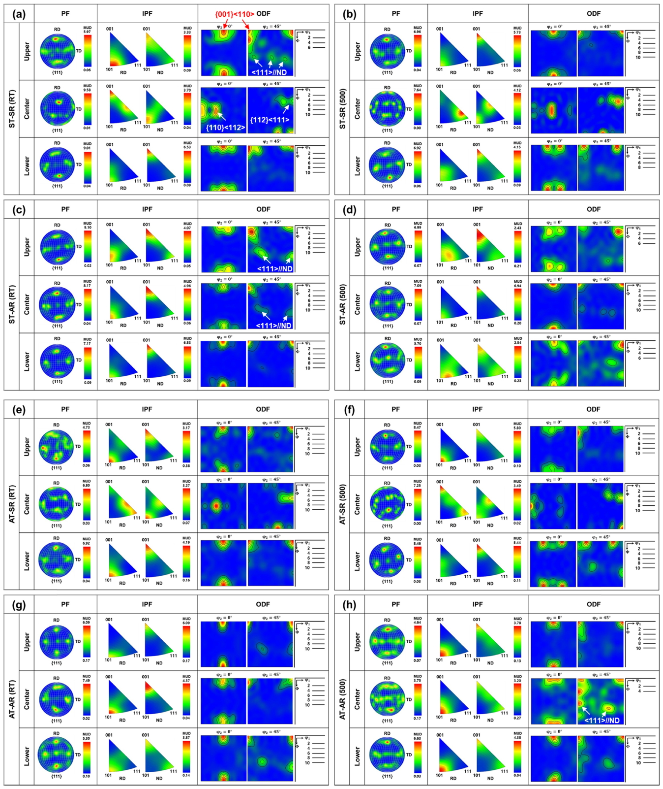 (ODF) for the symmetric and asymmetric rolled specimens. (a) ST-SR (RT), (b) ST-SR