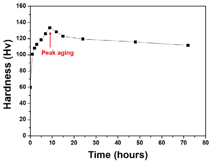 그림 2에 나타내었다. 그림 2에서 알 수 있는 것과 같이 9시간 열처리 시 가장 높은 경도 값을 보였으므로 본 연구에서는 시효처리 조건을 180 °C, 9시간으로 정하였다. 시효