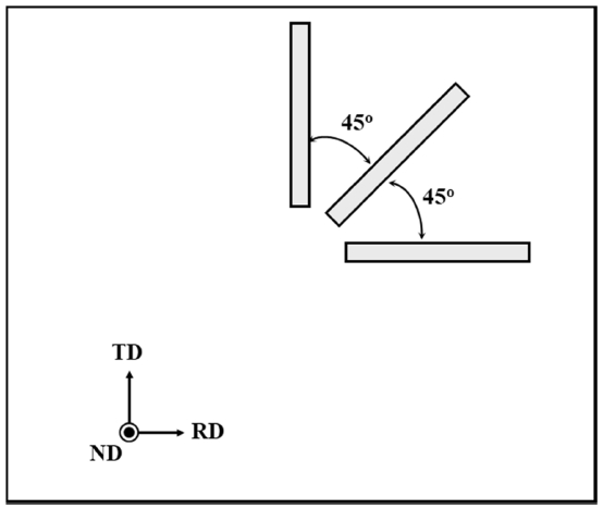 )과 소성이방성의 척도인 편차 r값 (Δr)값을 계산하였다. r값 측정을 위해 ASTM(E517-18) 규격[35]에 따라 그림 4와 같이 압연판재에서 압연방향 (RD)에 대하여 0°, 45°, 90°의 각도를 갖는 인장시편을 제작하였으며, 인장시험기 (MTDI, MINOS UT-100F)를