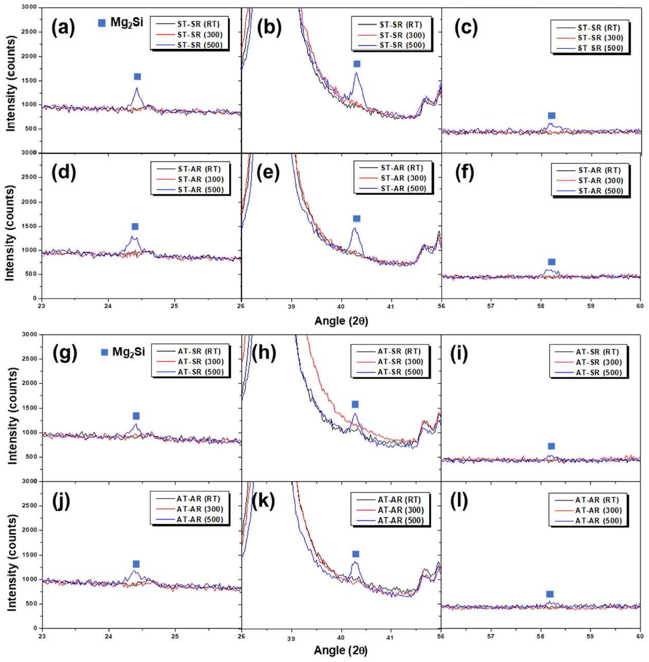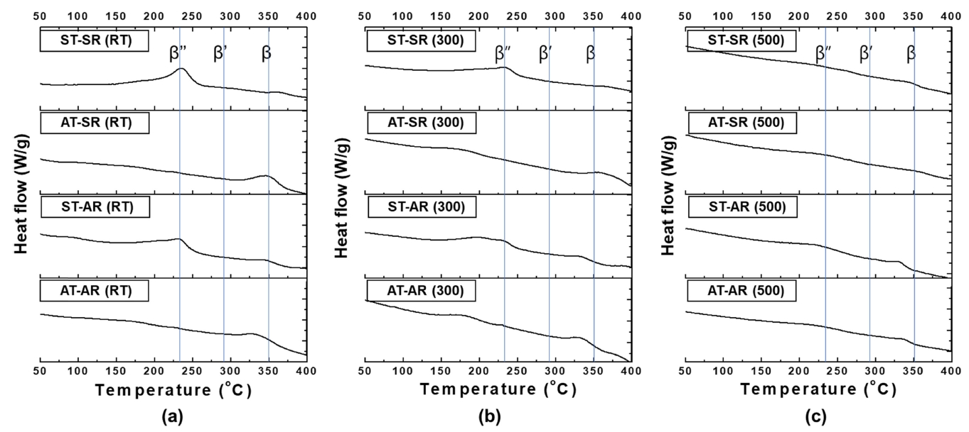 (500), (c) ST-AR (RT), (d) ST-AR (500), (e)AT-SR (RT), (f) AT-SR (500), (g) AT-AR