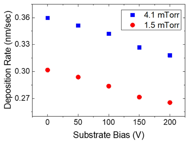 증가에 따라 증착률이 감소하는 경향을 보이며, 인가된 기판 바이어스 전 영역에 걸쳐 4.1 mTorr에서의 증착률이 1.5 mTorr에서의 증착률보다