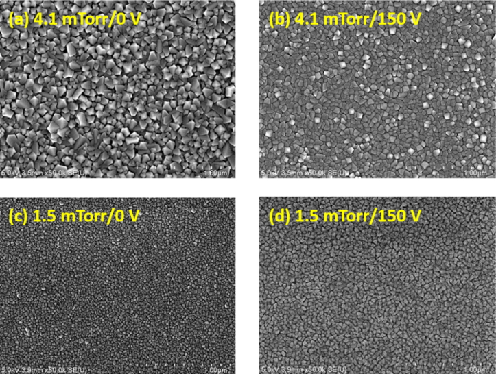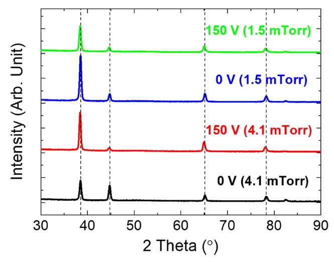 그림 2는 4가지 증착 조건 (4.1 mTorr/0 V, 4.1 mTorr/150 V, 1.5 mTorr/0 V, 1.5 mTorr/150 V)에서 증착된