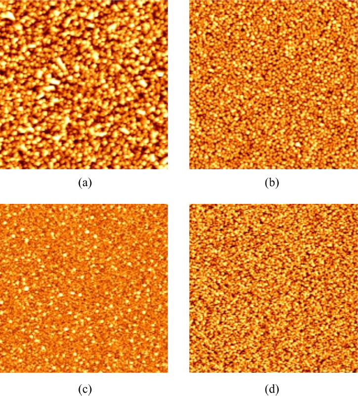 바이어스 전 영역에서 1.5 mTorr에서 증착된 박막보다 큰 결정립 크기를 가지고 있으며 결정립계 역시 상대적으로 명확하게 관찰이 되었다. 그림 4는 동일한 시편에 대한 원자 힘 현미경 스캔 결과를 보여주는 데, 기판 바이어스가 인가되지 않았을 때 4.1 mTorr에서 증착된 알루미늄 박막의