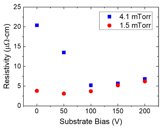 각각의 증착 조건에서 최적의 기판 바이어스 크기를 찾는 것이 중요하다. 그림 5에서 주목할 점은 기판 바이어스의 인가가 4.1 mTorr에서 증착된 박막의 비저항에 미치는 영향이 1.5 mTorr에서 증착된 박막 대비 훨씬 더