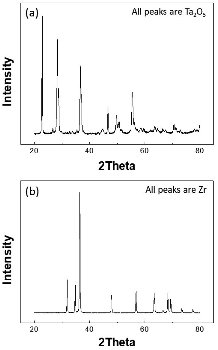X-ray diffraction patterns of the raw powders of (a) Ta2O5 and (b) Zr.