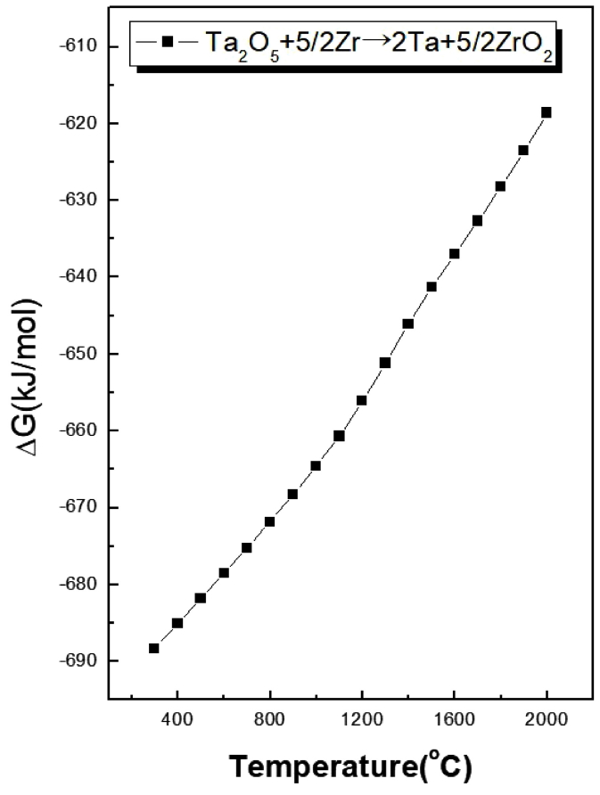 Temperature dependence of the Gibbs free energy in interaction of Ta2O5 and 5/2 Zr.