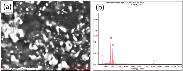 밀링한 분말의 주사전자현미경 EDS 분석 결과와 미세조직은 그림 4에 나타내었다. 분말들이 매우 미세하며 상호응집되어 있다. EDS 분석에서는 Ta, O와 Zr 피크만 관찰되고, 밀링 도중에 용기와 볼로부터 오염될