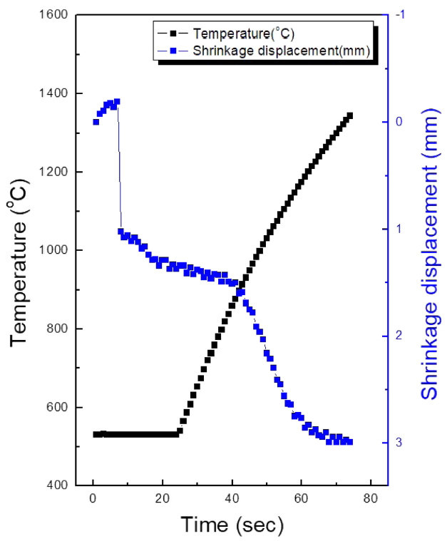 가했을 때 가열 시간 5초까지는 열팽창 현상을 보이다가 그 이상의 가열 시간에서는 수축 길이가 급격히 증가하였다. 또한, 수축 길이는 1300 °C