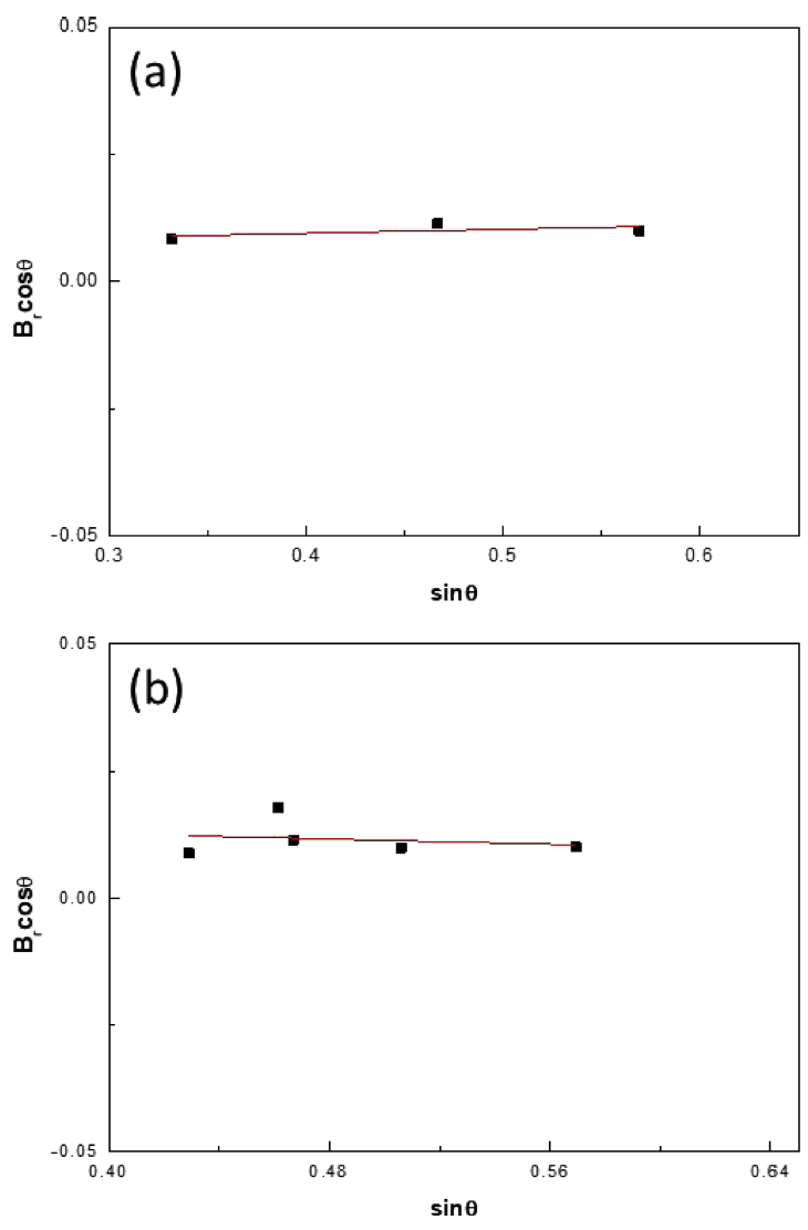 Plot of Br·cosθ versus sinθ for Ta (a) and ZrO2 (b) in the composite sintered at 1350 °C.