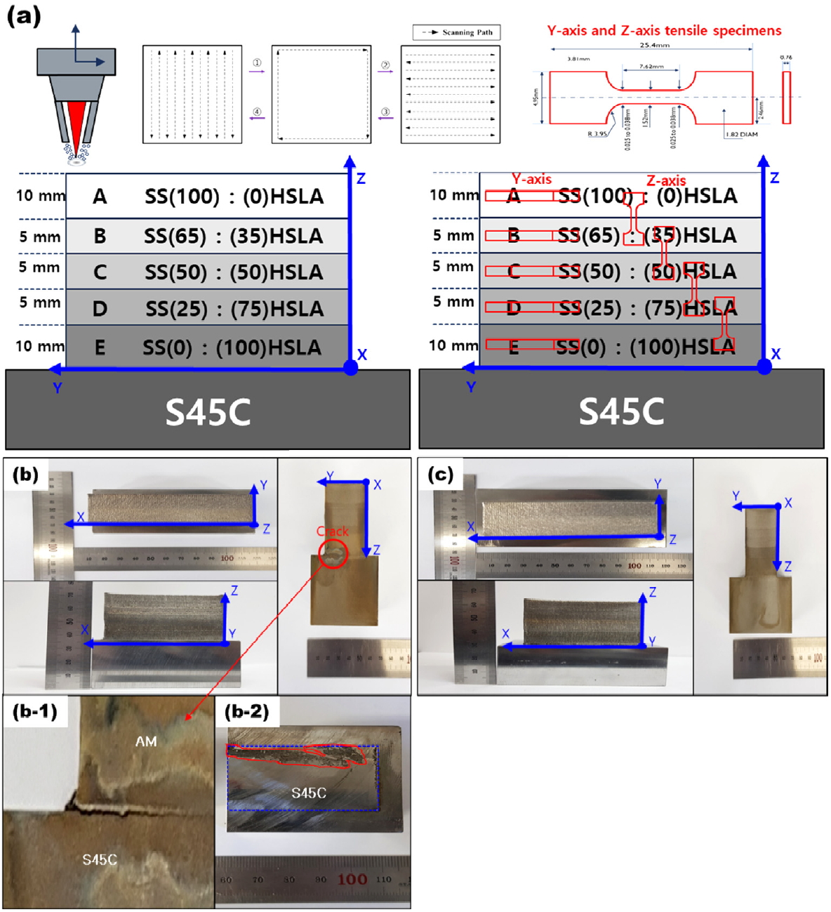of functionally graded material samples after DED process; (b) AM450W, (b-1) crack