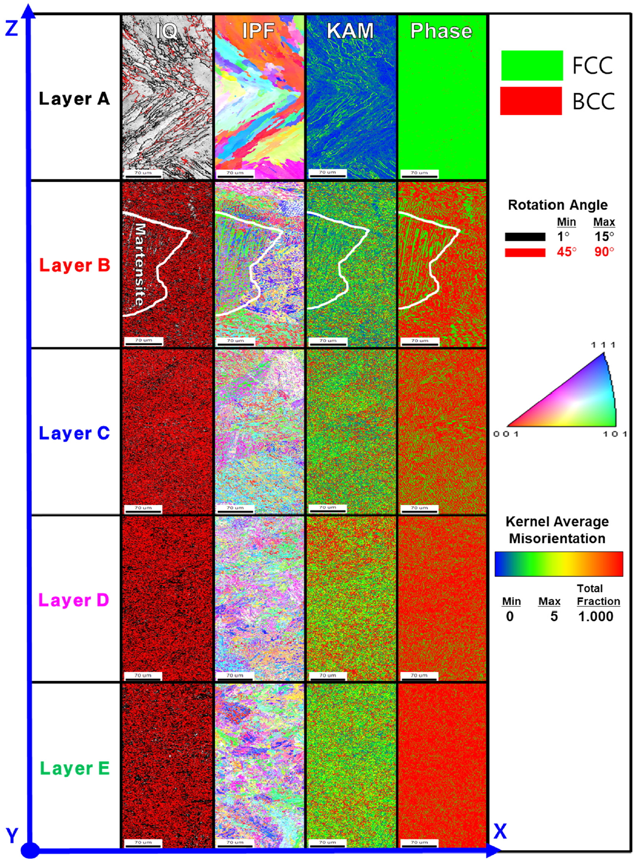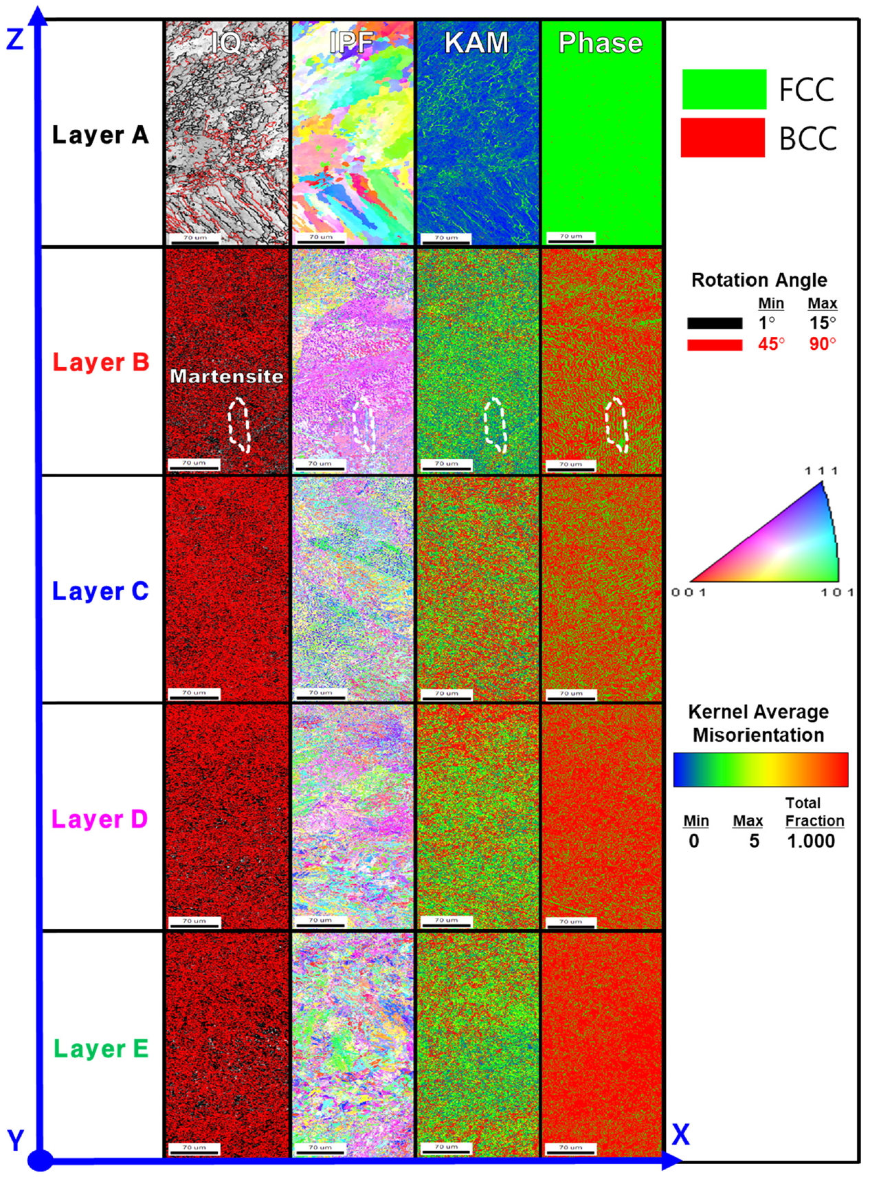 EBSD IQ with grain boundary rotation angle, IPF, and phase maps of each layers built