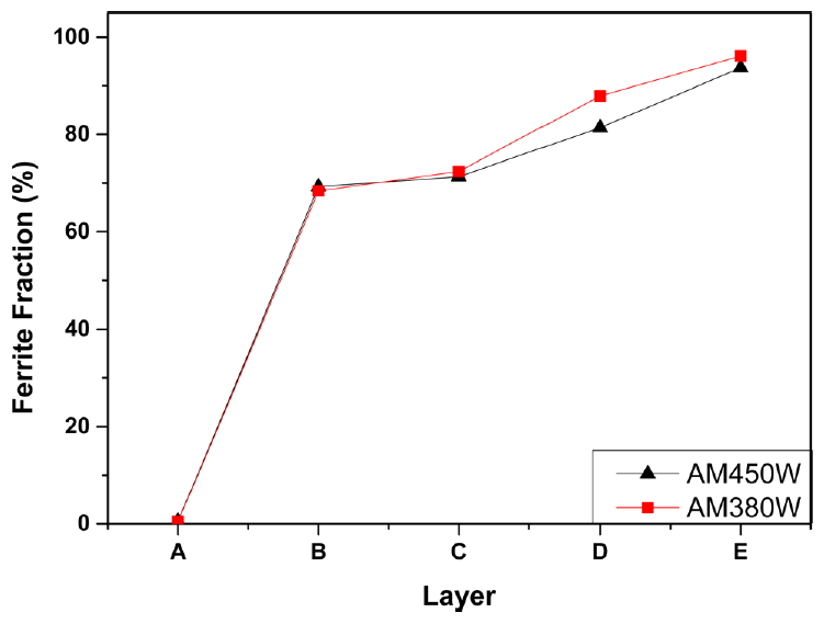 차이가 났다. 이후 E층에서도 두 시편의 페라이트 상분율은 3% 이내의 차이를 보이며 각각 93.7% (AM450W), 96.1% (AM380W)으로