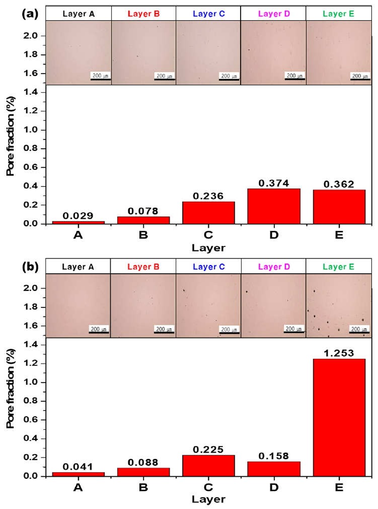 AM450W (그림 6(a))의 경우 A층 (0.029%)이 총 5개 층에서 가장 낮은 기공분율이고, 이 후 D층의 기공분율이 가장 높았다. E층은 D층 대비 0.014% 감소한