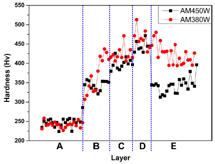 증가하지는 않았다. 각 층의 미세구조는 AM450W과 AM380W이 서로 매우 유사하였고 이는 레이저 출력에 따른 미세구조 변화가 크지 않았음을 보여준다.