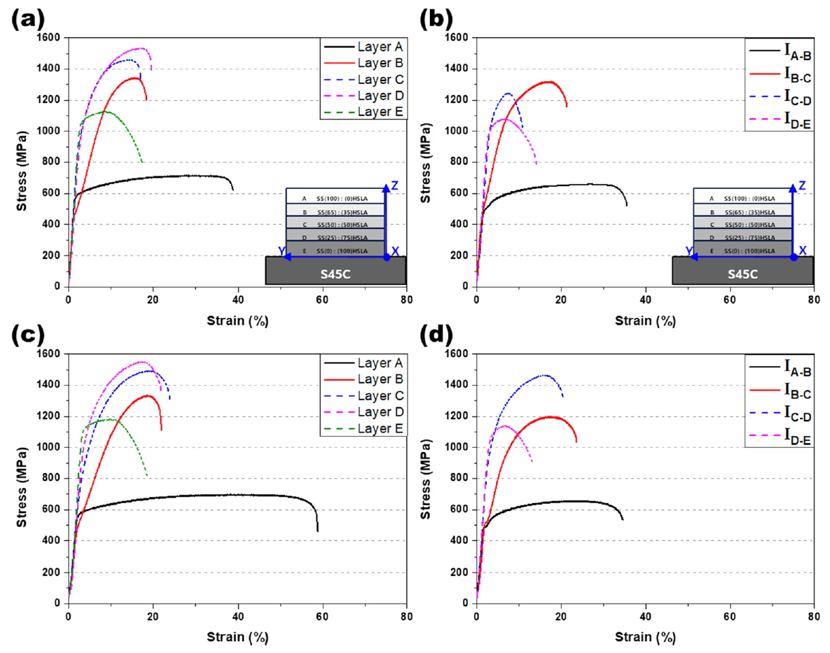 Steel, SS)과 고강도-저합금강 (High Strength Low Alloy, HSLA) 분말이 서로 다른 비율로 혼합된 적층 구조를 가지고