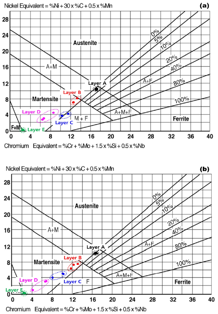 Schaeffler diagrams of additive manufactured FGM specimens; (a) AM450W and (b) AM380W.